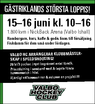 GÄSTRIKLANDS STÖRSTA LOPPIS! 15–16 juni kl. 10–16 1.800 kvm i NickBack Arena (Valbo Ishall) Hamburgare, korv, kaffe & godis finns till försäljning. Fiskdamm för dom små under lördagen. Valbo HC arrangerar klubbmästerskap i speedshooting! 20 kr/3 puckar. Inget begränsat antal försök. Prisutdelning i samband med A-lagets första hemmamatch i höst. Hjärtligt välkommen ner & avlossa en projektil