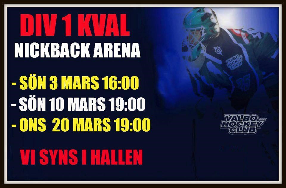 Då är kvalserien för nästa års division 1 c lottad vi börjar hemma på söndag mot stockholmslaget som inte är klart i dagsläget. Gnesta leder med 1-0 i matcher. Söndag 3 Mars 16.00 Valbo HC - Gnesta/Nynäshamn Onsdag 6 Mars 19.00 Hofors HC - Valbo HC Söndag 10 Mars 16.00 Valbo HC - Skedvi/Säter Söndag 17 Mars Skedvi/Säter - Valbo HC Onsdag 20 Mars 19.00 Valbo HC - Hofors HC Söndag 24 Mars 16.00 Gnesta/Nynäshamn - Valbo HC Så kom och stötta oss på Söndag i Nickback Arena!