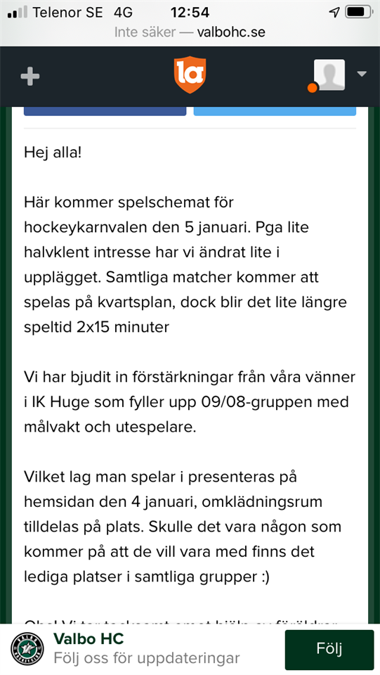 Hejsan, håll koll på VALBO HC (laget.se)hemsida 4/1 för er som deltar på Hockeykarneval 5/1. Mvh Fredrik