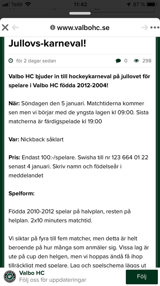 http://www.valbohc.se/news/6198311/Jullovs-karneval Valbo HC bjuder in till hockeykarneval på jullovet för spelare i Valbo HC födda 2012-2004! När: Söndagen den 5 januari. Matchtiderna kommer sen men vi börjar med de yngsta lagen kl 09:00. Sista matcherna är färdigspelade kl 19:00 Var: Nickback såklart Pris: Endast 100:-/spelare. Swisha till nr 123 664 01 22 senast 4 januari. Skriv namn och födelseår i meddelandet Spelform: Födda 2010-2012 spelar på halvplan, resten på helplan. 2x10 minuters matchtid. Vi siktar på fyra till fem matcher, men detta är helt beroende på hur många som anmäler sig. Vissa lag är ute på cup den helgen, men vi hoppas ändå få ihop tillräckligt med spelare. Lag och spelschema läggs ut längre fram. Grupper (preliminärt): 12/11/10 09/08 07/06 05/04 Sista anmälningsdag 30/12 Anmäler er här: VHCHOCKEYKARNEVAL Frågor? Hör av dig till karnevalgeneral Pär Laurén på mail: plauren@hotmail.com U-16 Team 10 17 dec 2019 0kommentarer