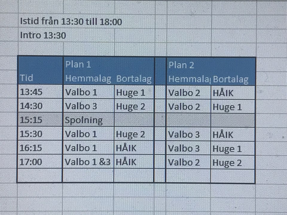 Hejsan, här kommer spelschema. Laguppställningar kommer i slutet på veckan. Det kommer vara intro 13,30 och 14,30, så att alla barn får intro. Mvh Fredrik/Stefan/Fredrik